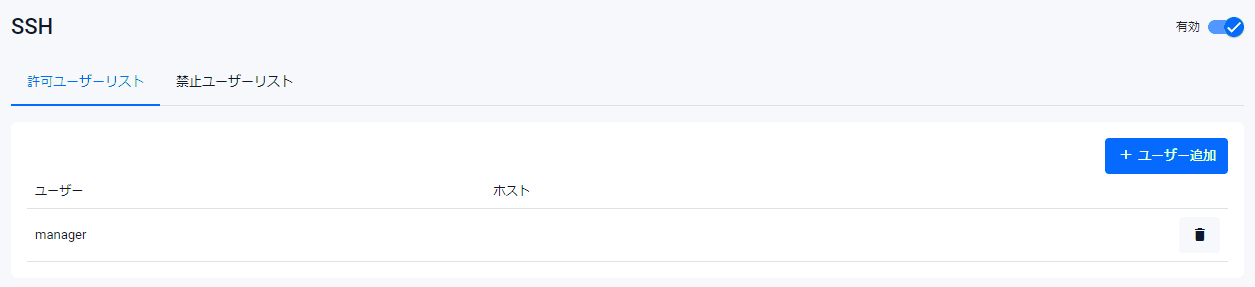 Note本製品にSSHログインするには、SSHサービスの有効化だけでなく、許可ユーザーの登録も必要です。