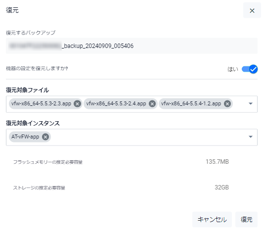 | 復元対象インスタンス | リストアするアプリケーションの設定(ライセンス、シリアル番号含む)を選択します |