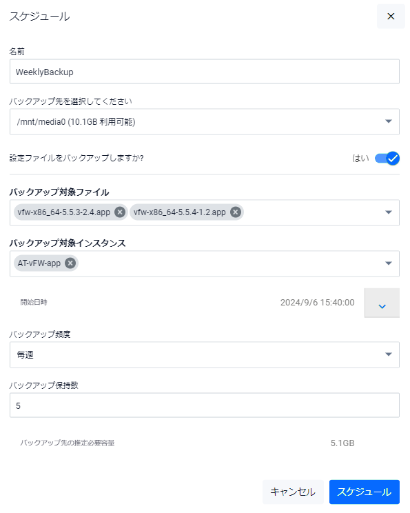 | バックアップ保持数 | 本スケジュールによって作成されたバックアップファイルを最新の何個まで保持するかを指定します |
