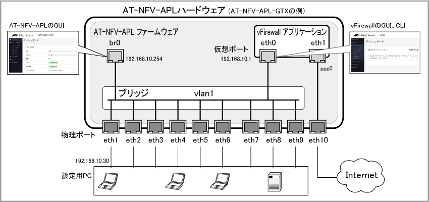 AT-NFV-APLとvFirewallは、それぞれ独立したIPアドレスや管理インターフェース(設定画面)を持ち、以下のように役割を分担します。