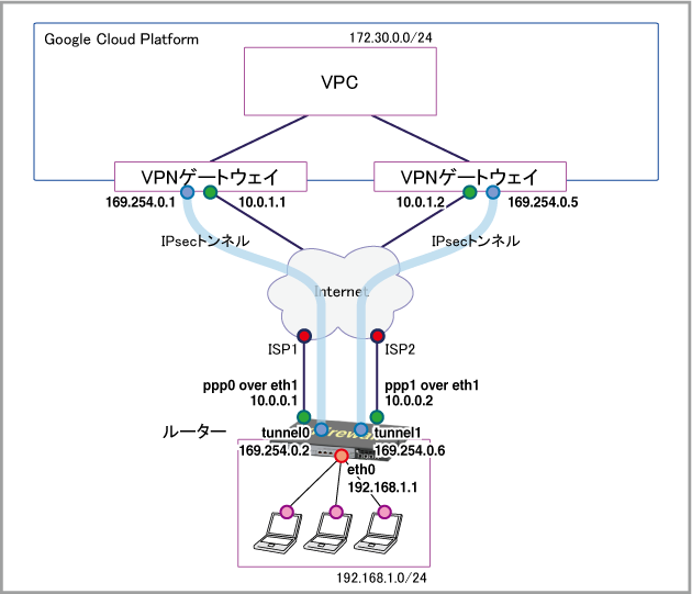 zone private network lan ip subnet 192.168.1.0/24 network peer ip subnet 172.30.0.0/24 network tunnel ip subnet 169.254.0.0/30 ip subnet 169.254.0.4/30