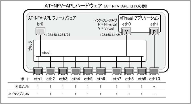 Note10ポート構成(eth1~eth10)のAT-NFV-APL-GTXを想定した例になっていますので、6ポート(eth1~eth6)構成のAT-NFV-APL-GTをご使用の場合は、使用するポートを適宜読み替えてください。