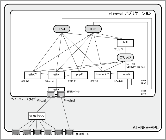 vFirewallのEthernetインターフェースには、AT-NFV-APL物理インターフェースとの接続方式によって2種類ありますが、vFirewall側ではどちらのタイプも同じEthernetインターフェースとして差異なく扱うことができます。