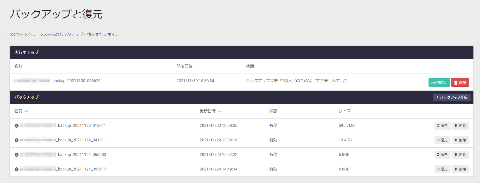 | ストレージの推定必要容量 | 復元する際に必要な、「システム」 > 「コンテナサービス」画面における「コンピュートノード」の「ストレージ」の空き容量です |