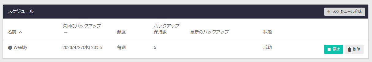 | バックアップ保持数 | 本スケジュールによって作成されたバックアップファイルを最新の何個まで保持するかを指定します |