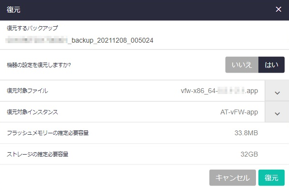 | ストレージの推定必要容量 | 復元する際に必要な、「システム」 > 「コンテナサービス」画面における「コンピュートノード」の「ストレージ」の空き容量です |