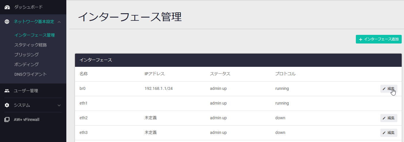 NoteAT-NFV-APLのGUI設定画面からvFirewallのWeb GUIにアクセスするための「開く」ボタンでは、vFirewallのeth0インターフェースに設定されているIPアドレスを管理用IPアドレスだと仮定しています。そのため、特に理由がない限り、最初に設定するインターフェースに管理用のIPアドレスを設定するようにしてください。