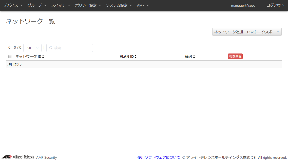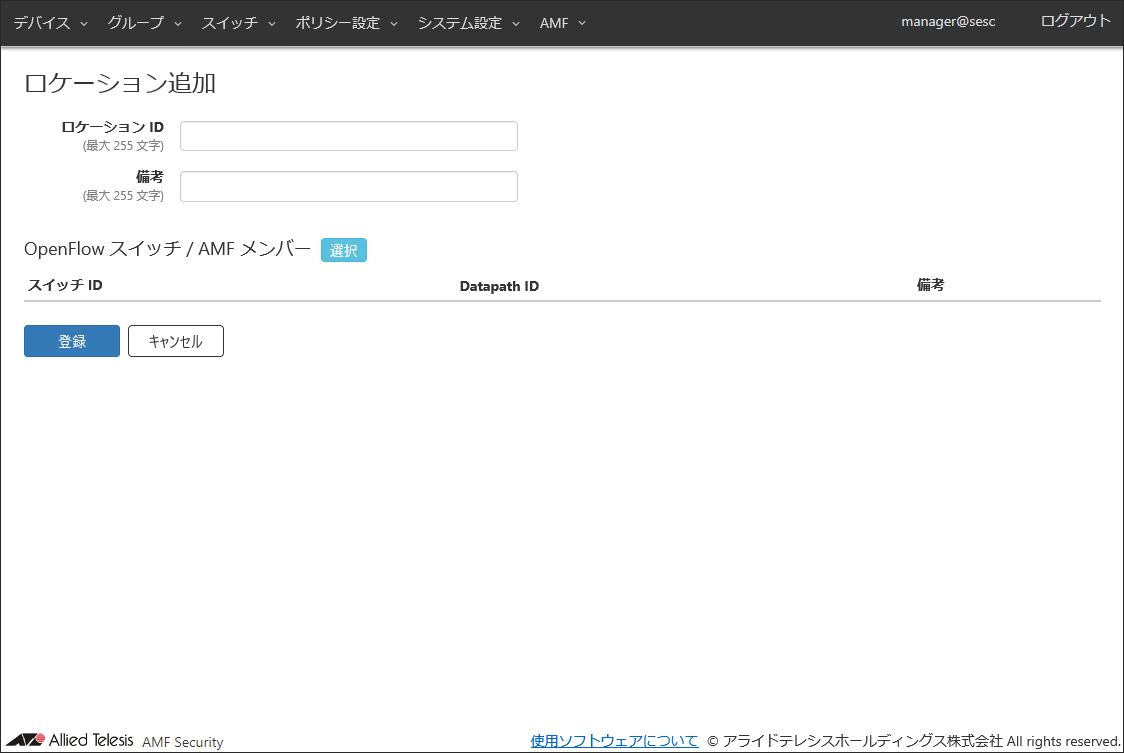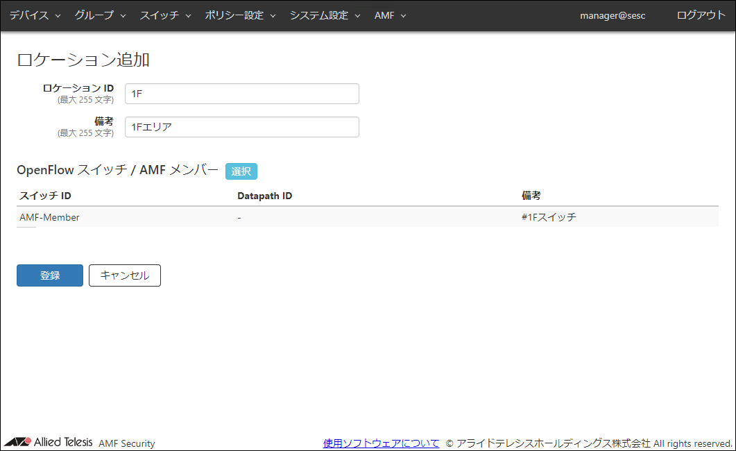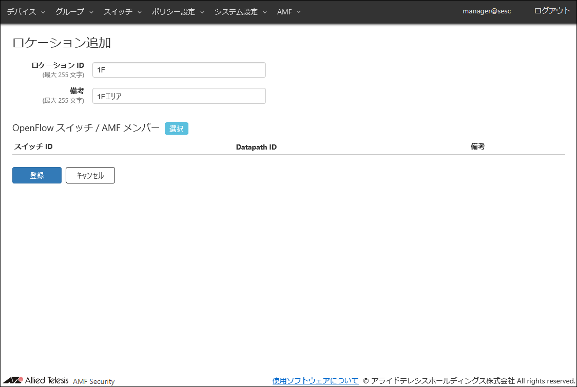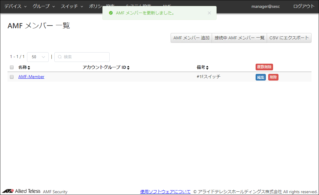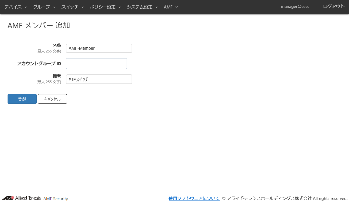 | 備考 | #1Fスイッチ | AMFメンバーの追加説明やコメントを記載できます。 備考は最大255文字で、英数字、記号以外に日本語も使用できます。 |