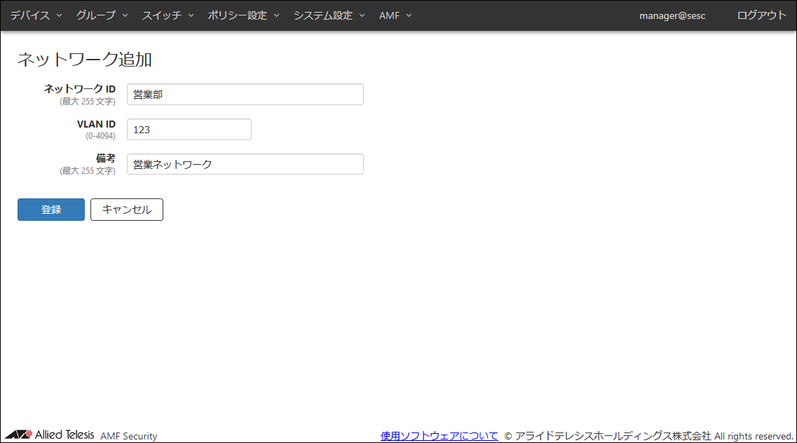 | ネットワーク ID(必須項目) | 営業部 | ネットワークの名称です。 既に使用されているネットワークIDを設定することはできません。 ネットワークIDは最大255文字で、英数字、記号以外に日本語も使用できます。 |
