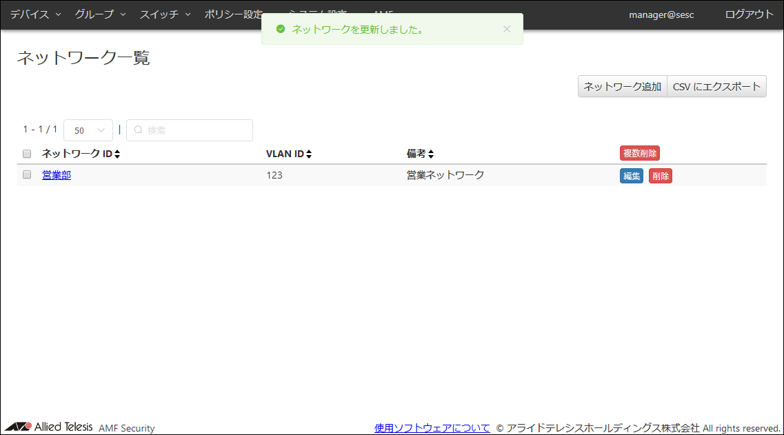 | 備考 | 営業ネットワーク | このネットワークの追加説明やコメントを記載できます。 備考は最大255文字で、英数字、記号以外に日本語も使用できます。 |