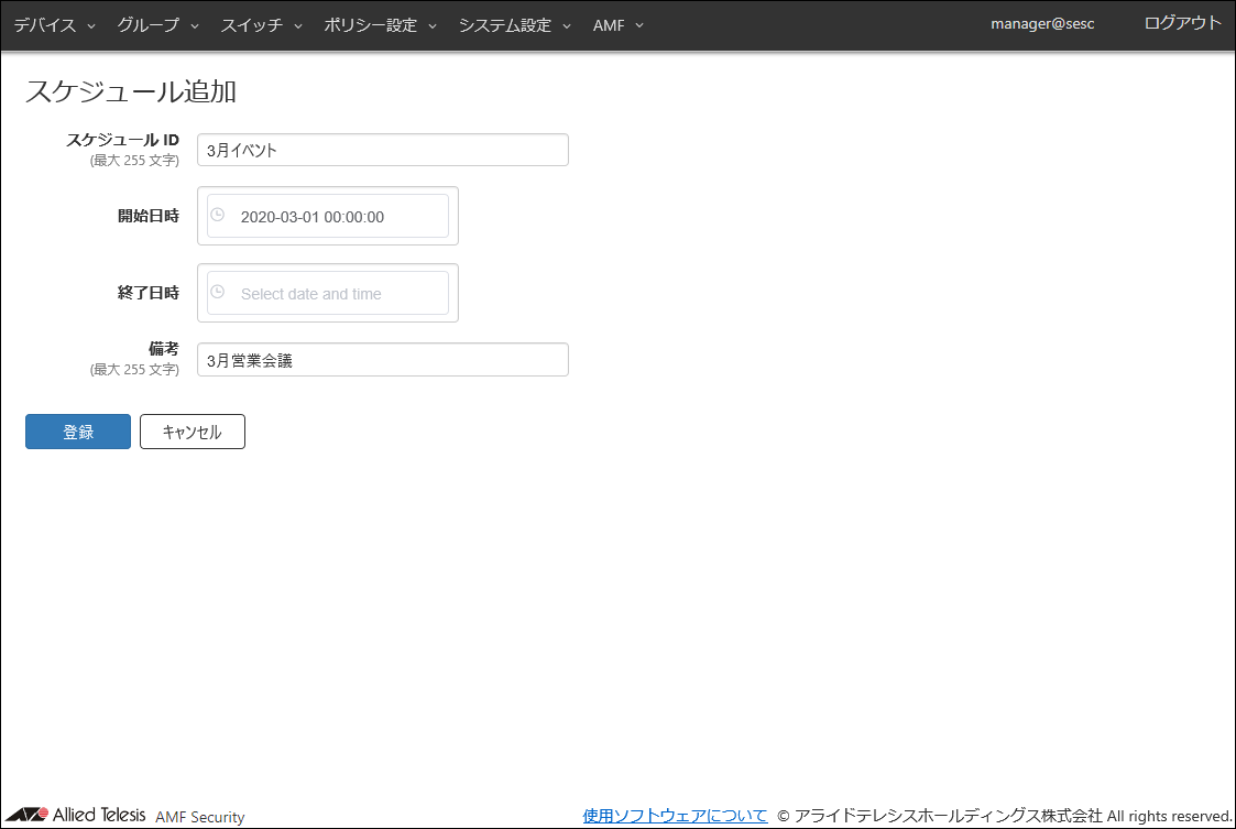 | スケジュール ID(必須項目) | 3月イベント | スケジュールの名称です。 既に使用されているスケジュールIDを設定することはできません。 スケジュールIDは最大255文字で、英数字、記号以外に日本語も使用できます。 |