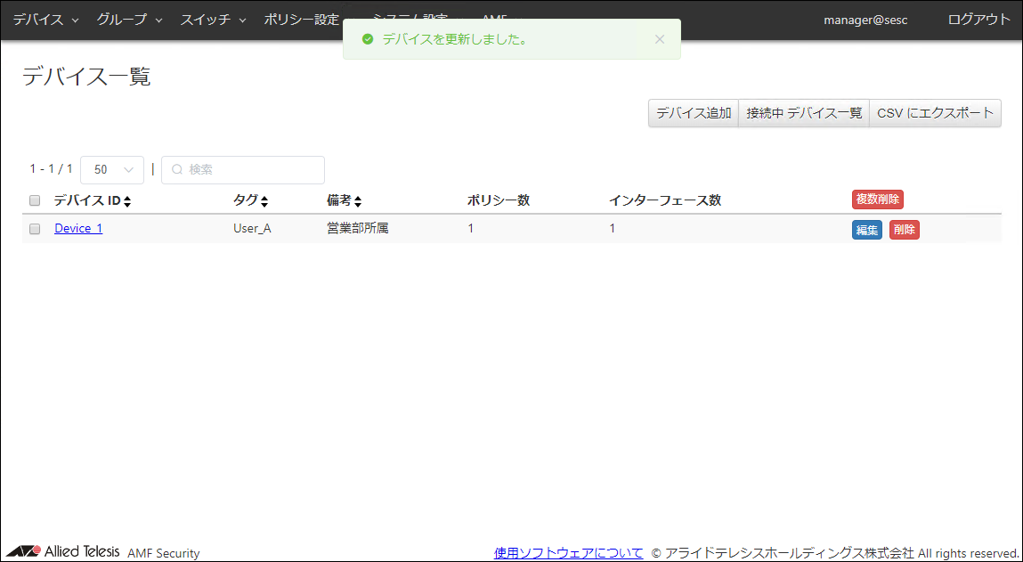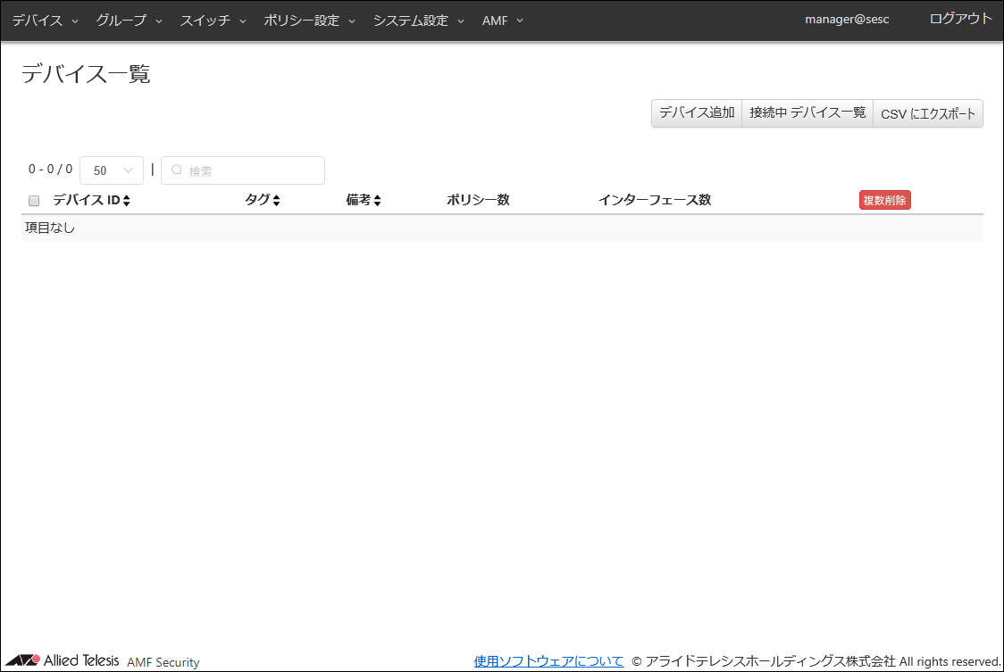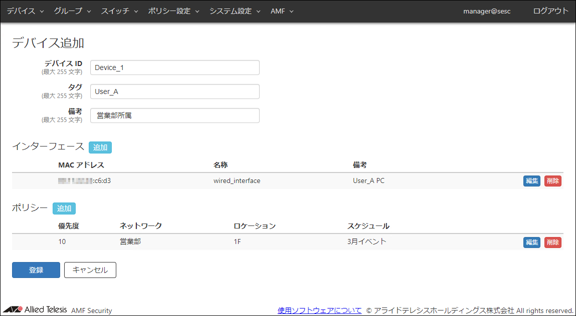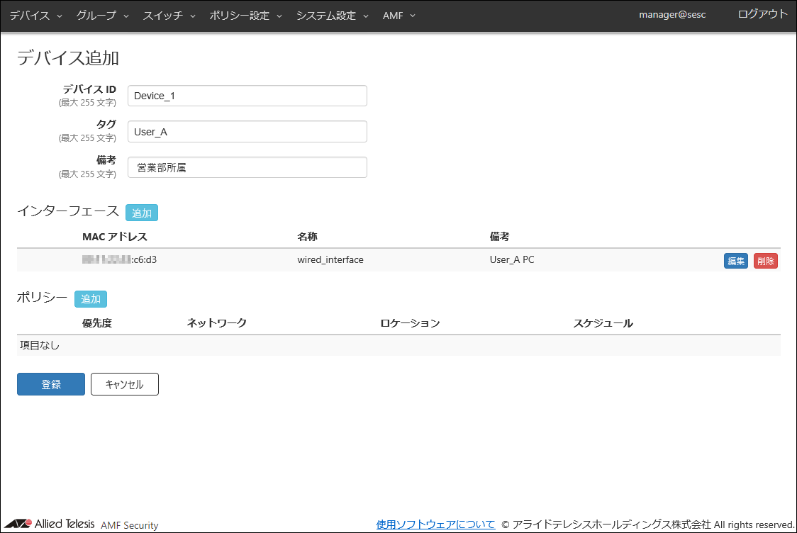 Noteセキュリティーポリシーを空欄にしたままデバイスを登録すると、デバイスは一時的にタグなしVLANに接続されます。既に利用者に配備済みのデバイスを登録する場合は、本ページに記載するように、デバイス情報の入力からセキュリティーポリシーの適用までを、一度に設定することをおすすめします。