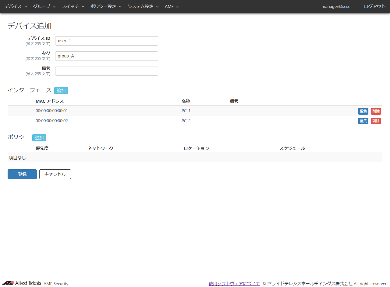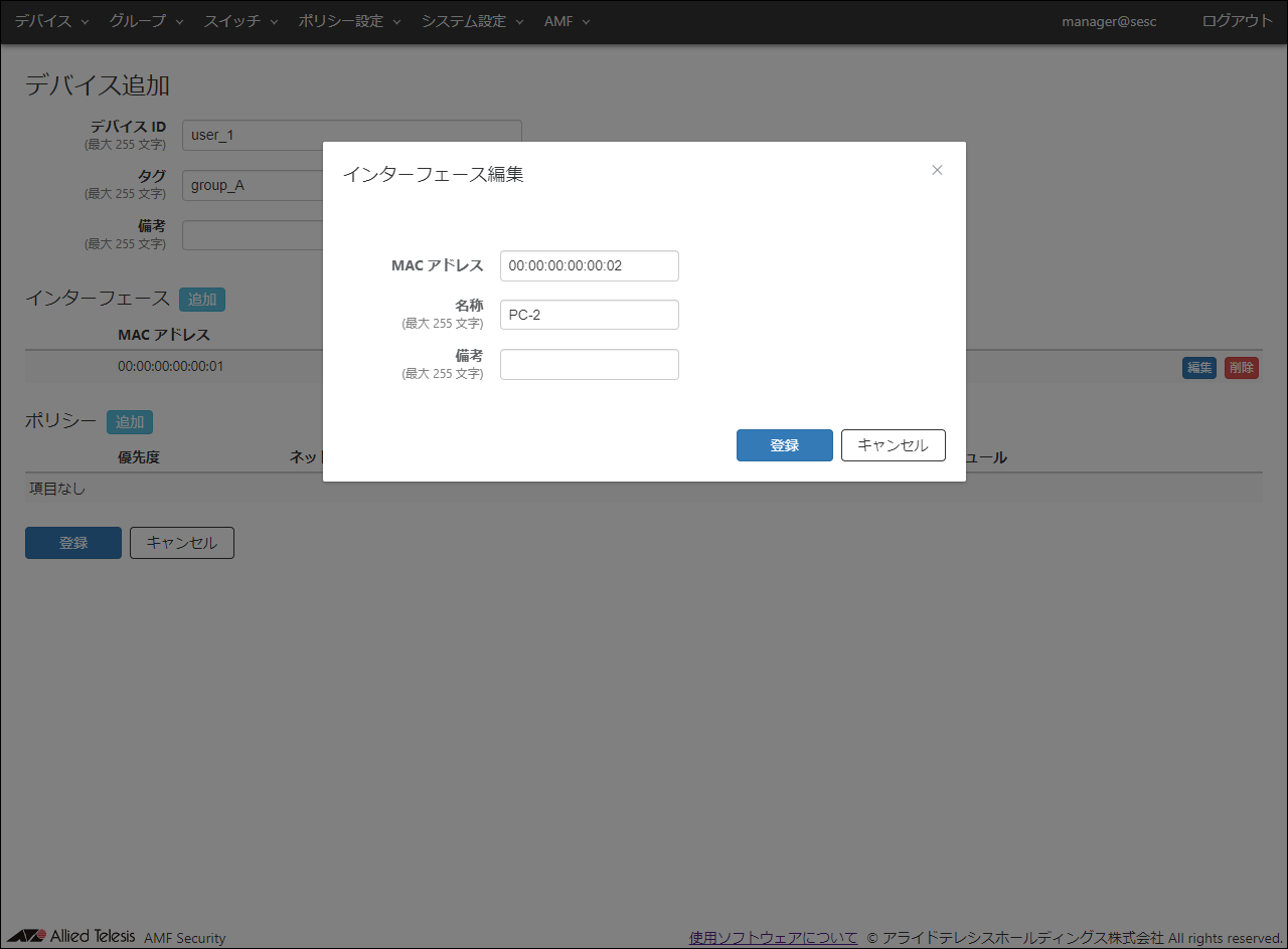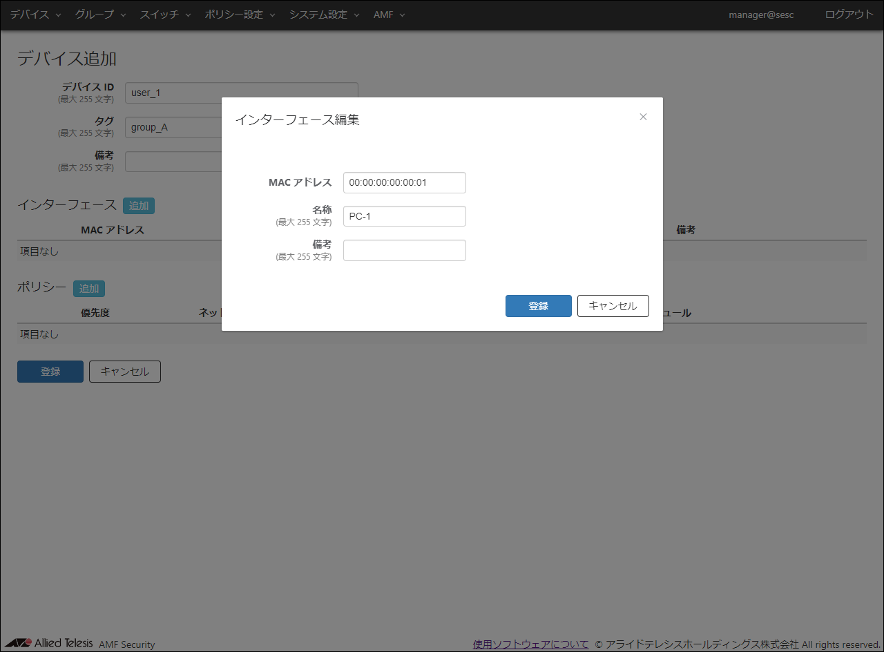 | インターフェース(MAC アドレス) | 00:00:00:00:00:01 00:00:00:00:00:02 |