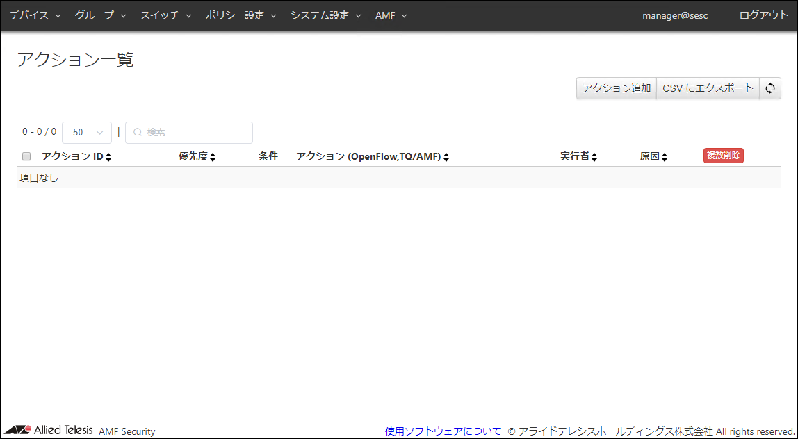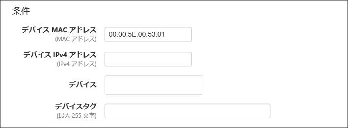 | デバイス MAC アドレス | 00:00:5E:00:53:01 | アクションの対象とするデバイスのユニキャストMACアドレスを指定します。 MACアドレスの表記として使用可能なフォーマットは下記となります。 xx:xx:xx:xx:xx:xx, xx-xx-xx-xx-xx-xx, xxxx.xxxx.xxxx |