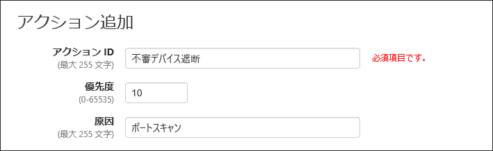 | 原因 | ポートスキャン | アクションの原因、適用理由など、管理上の情報を登録します。 原因は最大255文字で、英数字、記号以外に日本語も使用できます。 |