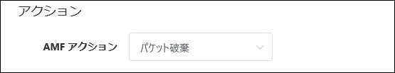 | AMF アクション | パケット破棄 | AW+のAMFアプリケーションプロキシー機能を使用して、該当デバイスの通信遮断を指示する際のアクションの内容です。 ・AMF 依存: AMF Security miniからはアクションを通知せず、AMF機器側の設定に依存します。 ・隔離: 該当デバイスを隔離用VLANに移動します。 ・パケット破棄: 該当デバイスの通信をレイヤー2(MACレベル)で破棄します。 ・リンクダウン: 該当デバイスが接続されているポートを無効化します。 ・IPフィルター: 該当デバイスの通信をレイヤー3(IPレベル)で破棄します。 ・ログ: AMF Security miniからログのアクションを通知しますが、該当デバイスの通信制御は行わずログのみを出力します。 |