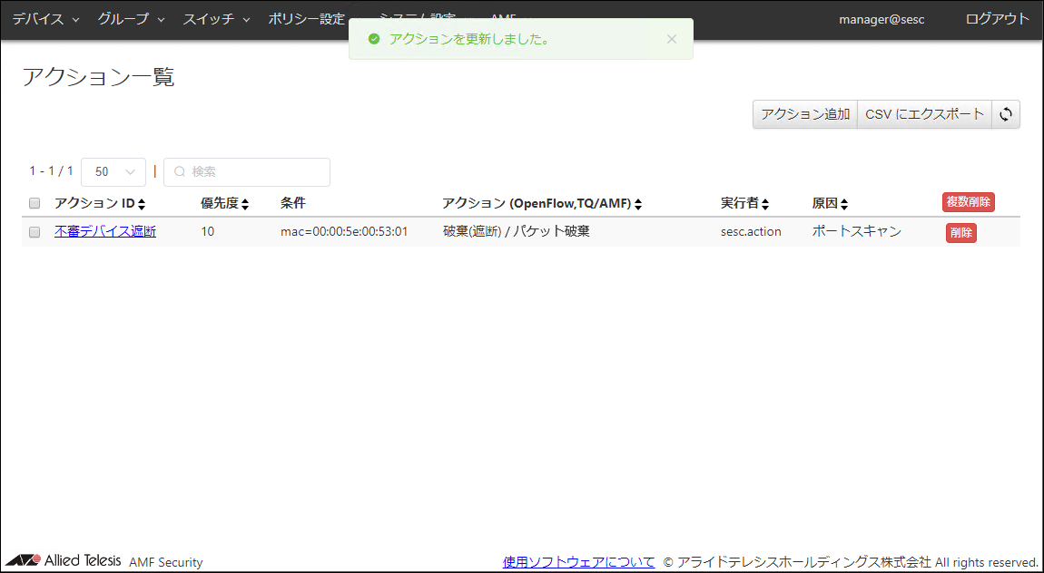 | アクション ID(必須項目) | 不審デバイス遮断 | AMF Security miniに登録するアクションのIDです。 既に使用されているアクションIDを設定することはできません。 アクションIDは最大255文字で、英数字、記号以外に日本語も使用できます。 |