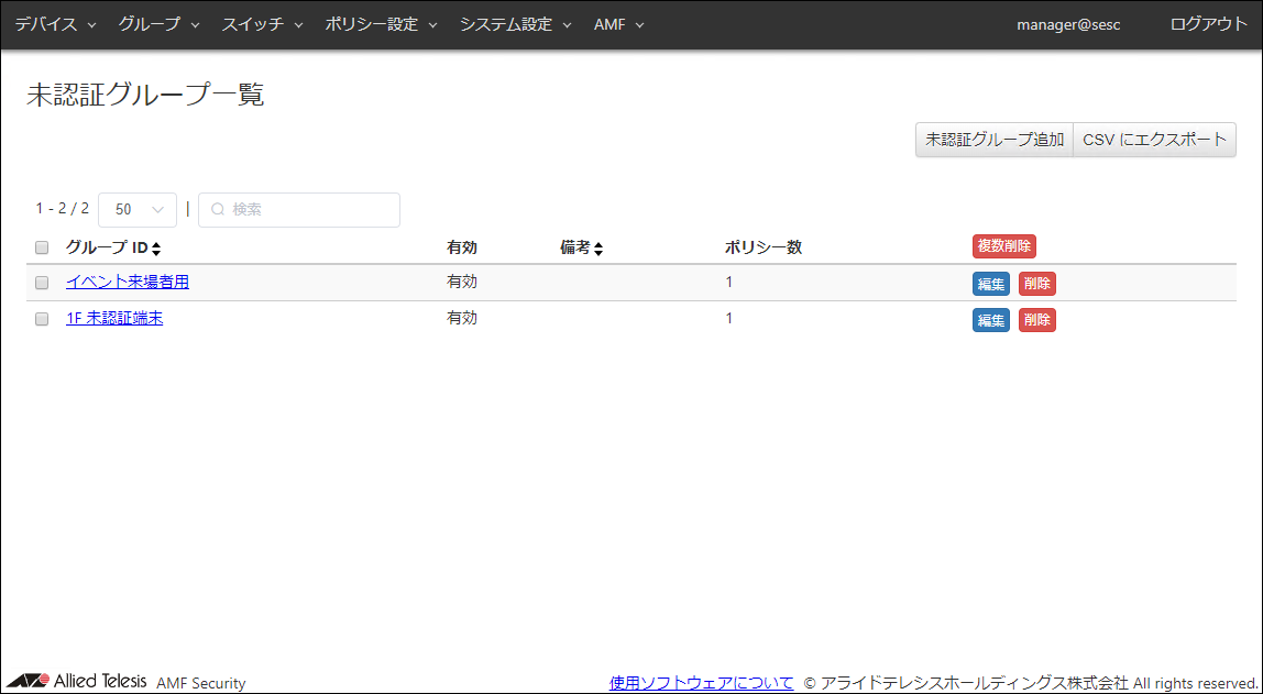| 編集 | 選択した未認証グループの「未認証グループ更新」画面を表示します。 |