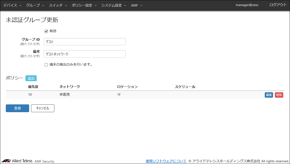 | 追加 | 「ポリシー編集」ダイアログを表示し、未認証グループに設定するセキュリティーポリシーを新しく登録します。 |