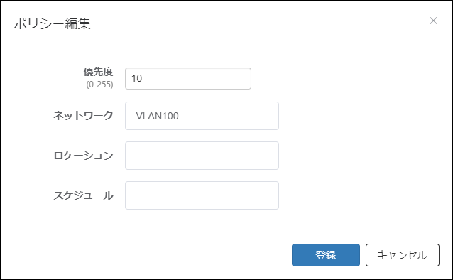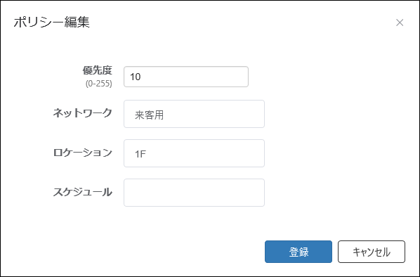 | 優先度(必須項目) | セキュリティーポリシーを適用する優先度です。0~255の数字で入力します。 複数のセキュリティーポリシーが設定されている場合、未認証グループのデバイスがAMFメンバーに接続されると、最も優先度の値が小さいセキュリティーポリシーから順に一致するかどうかの判定が行われます。 |