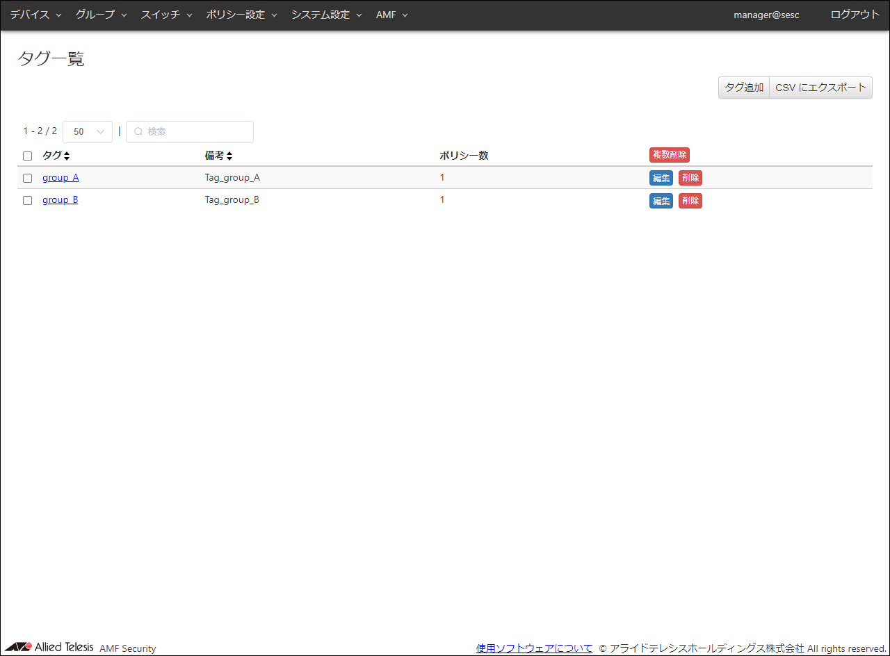 | ポリシー数 | タグに設定されたセキュリティーポリシーの数です。 |