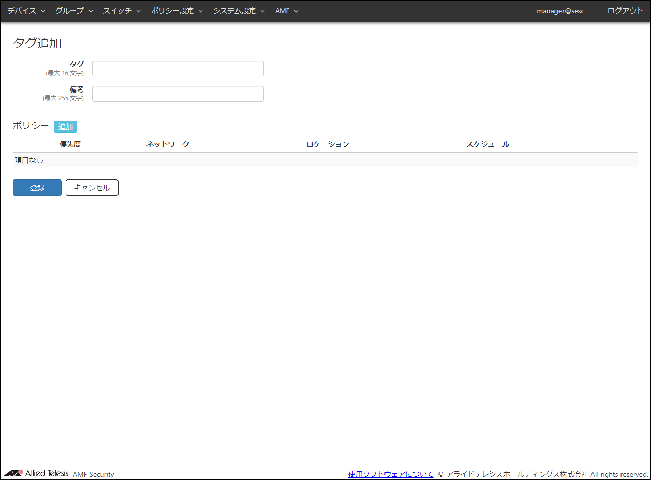 | タグ(必須項目) | AMF Security miniに登録するタグです。 既に使用されているタグを設定することはできません。 タグは「デバイス」/「デバイス一覧」画面で登録する「デバイス ID」に設定の「タグ」と同一のものを設定します。 タグは最大16文字で、英数字(セミコロン(;)を除く)、記号以外に日本語も使用できます。 |