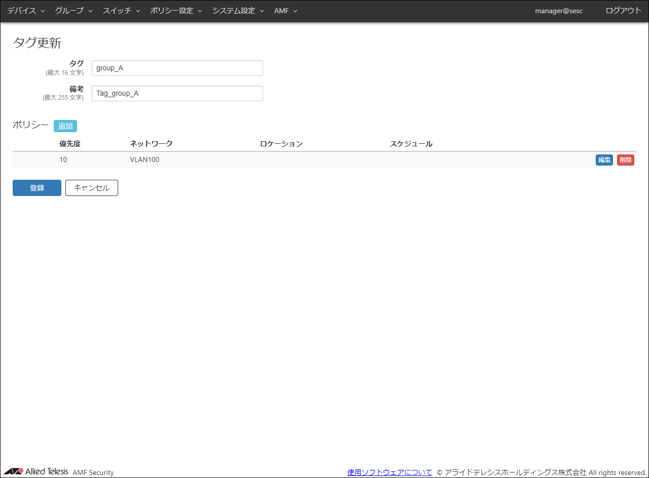 | ロケーション | タグに収容するロケーション(場所)を選択します。 事前に登録されたロケーションIDが100件までドロップダウンリストに表示されます。また、テキストフィールドに文字列を入力すると、入力した文字列をロケーションIDまたは備考のいずれかに含むロケーションIDが100件までドロップダウンリストに絞り込み表示されます。表示されたドロップダウンリストの候補から、対象とするロケーションIDをクリックします。 ロケーションを設定した場合は、そのロケーションに登録されたAMFメンバーからのみ接続が可能となります。 ロケーションが選択されていない場合は、すべてのAMFメンバーからアクセス可能です。 タグにロケーションを設定するためには、事前にロケーションを登録する必要があります。ロケーションの登録については、「ポリシー設定」/「ロケーション追加」をご参照ください。 |