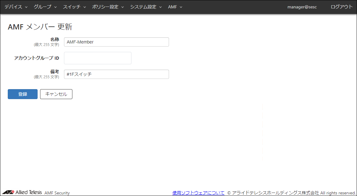 | 登録 | 選択したAMFメンバーの「AMF メンバー 更新」画面を表示します。 |