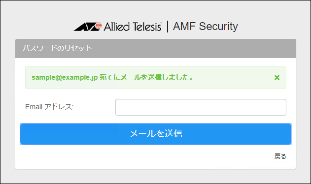 下記のリンクからAMF Securityのパスワード再設定ページにアクセス出来ます。このページでパスワードを再設定して下さい。 https://(AMF SecurityのIPアドレス)/page/system/password_reset/xxxxxxxxxxxxxxxxxxx このページは10分間有効です。10分以内に再設定を行って下さい。 もしお心当たりがない場合は、このメールを無視して下さい。パスワードは変更されません。