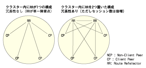 このような制限があるため、BGPスピーカーは同一ASに所属する他のすべてのBGPスピーカーとセッションを張る必要があります。結果としてAS内にはメッシュ状にI-BGPセッションが張られることになります。メッシュ構成の煩雑さを避けるための手段として「ルートリフレクション」や「ASコンフェデレーション」があります。