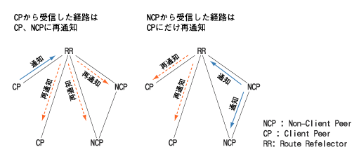 E-BGPとI-BGPは原則的に同じ動作ですが、学習した経路を他のBGPピアに再通知するときのルールに違いがあります。BGPスピーカーは、あるI-BGPピアから学習した経路を別のI-BGPピアに通知することができません。これはAS内における経路情報のループを防ぐためです。I-BGPで学習した経路をE-BGPピアに通知すること、E-BGPピアから学習した経路をI-BGPで通知することは問題ありません。