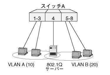 VLANタグを利用して、ポート4を2つのVLANに所属させ、どちらのVLANからも802.1Q対応サーバーにアクセスできるようにします。