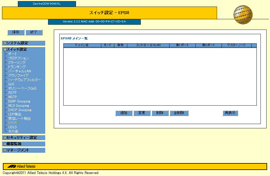 「全削除」をクリックすると作成済みのEPSRドメインがすべて削除されます。「全削除」はPURGE EPSRと同じです。EPSRの設定はデフォルト状態に戻ります。