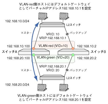 - VLAN-redがダウンした場合に VLAN-green側(VRID=20)の優先度を 99 に下げ、スイッチBがマスタールーターになるよう設定します。