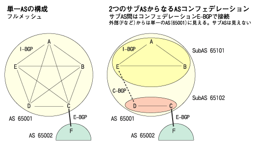 異なるASに属するスピーカー同士のセッションをE-BGP(External BGP)、同じASに属するスピーカー同士のセッションをI-BGP(Internal BGP)と呼びます。