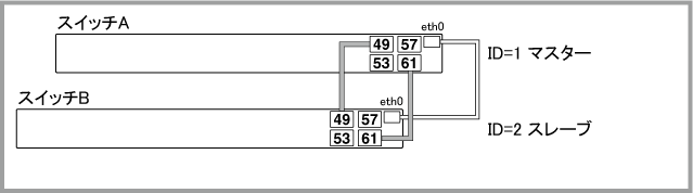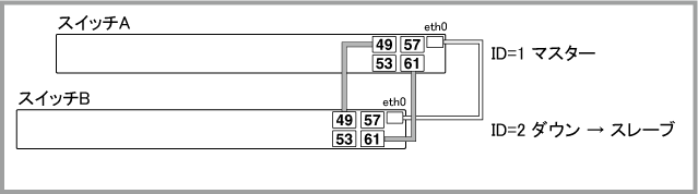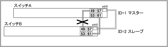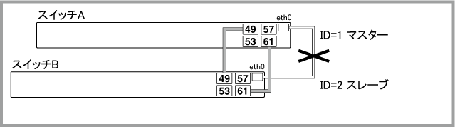 Noteマスター(ID=1)の正常起動後にポートがリンクアップして通信が可能な状態になりますが、通信が復旧するまでの時間は、ネットワーク環境と使用しているプロトコルの復旧時間に依存します。マスター(ID=1)は正常起動するまでポートをリンクアップしません。旧マスター(ID=2)も再起動中はリンクダウンするため、マスター(ID=1)がコンフィグを読み込んでから正常起動するまでの間、一時的にVCSグループの全ポートがリンクダウンしている状態になります。