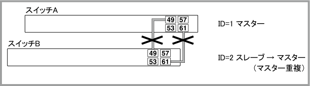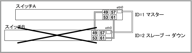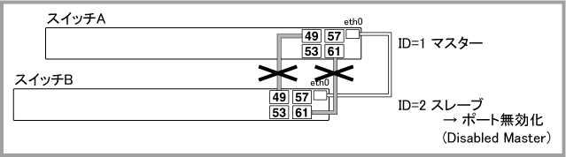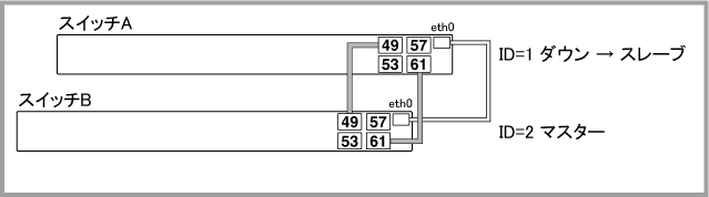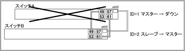 Noteマスター(ID=1)の正常起動後にポートがリンクアップして通信が可能な状態になりますが、通信が復旧するまでの時間は、ネットワーク環境と使用しているプロトコルの復旧時間に依存します。マスター(ID=1)は正常起動するまでポートをリンクアップしません。旧マスター(ID=2)も再起動中はリンクダウンするため、マスター(ID=1)がコンフィグを読み込んでから正常起動するまでの間、一時的にVCSグループの全ポートがリンクダウンしている状態になります。