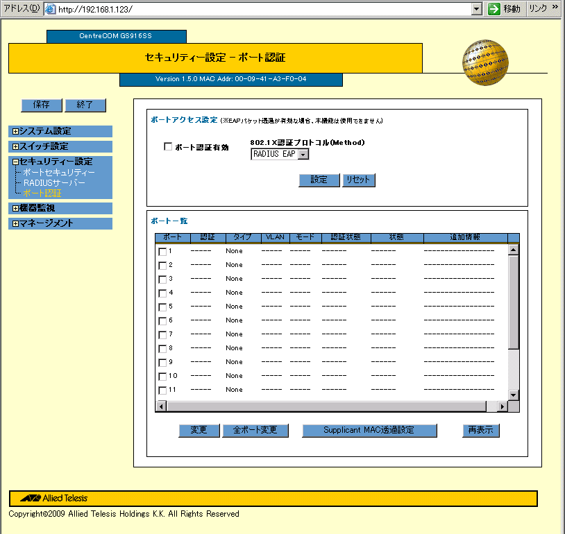 - Supplicant MAC透過設定では、複数のポートを選択することはできません。