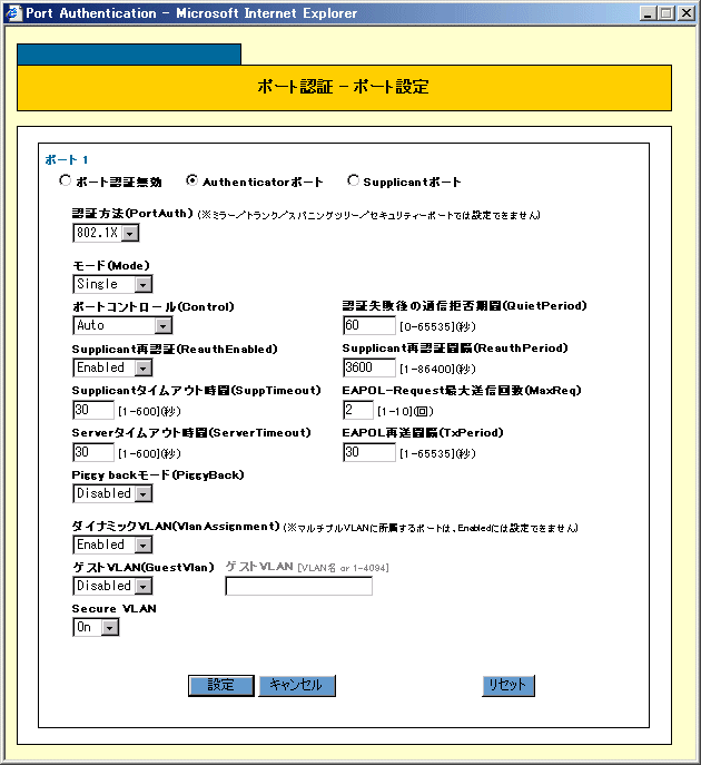 - Supplicant再認証(ReauthEnabled):Supplicantポートの再認証を行うかどうかをリストから選択