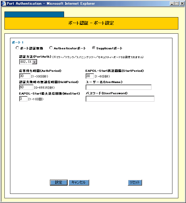ポートをSupplicantポートに指定したい場合は、「Supplicantポート」にチェックを付け、次の項目を設定します。