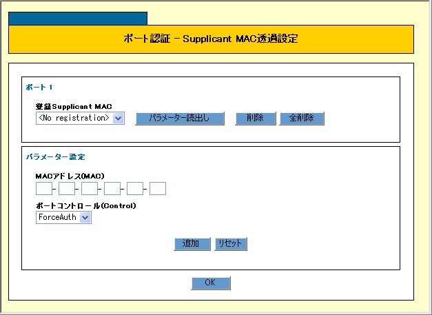 「ポート認証 - Supplicant MAC透過設定」で、ポートのSupplicant MAC透過アドレスの設定を行います。