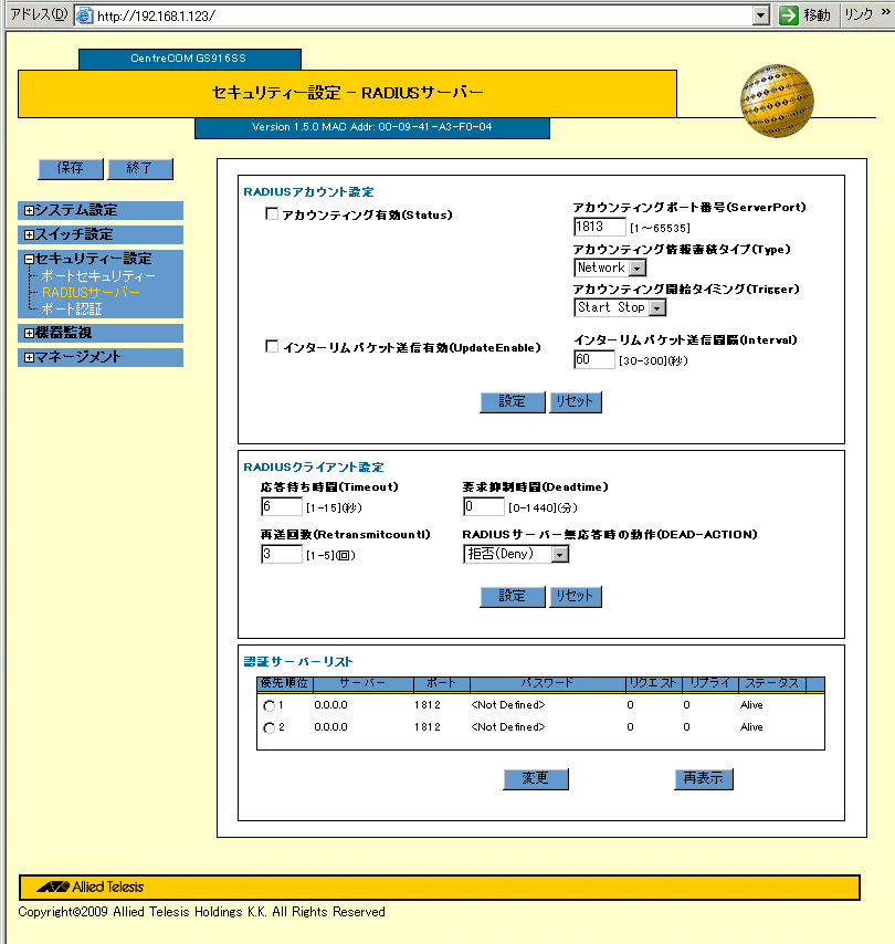 ユーザー認証、ポート認証で使用するRADIUSサーバー(Remote Authentication Dial In User Server)の登録および、RADIUSサーバーのアカウンティング機能に関する設定を行います。