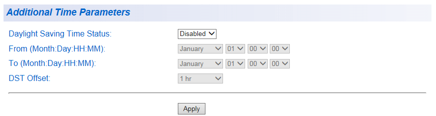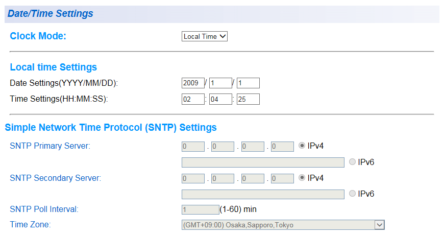- System Time - Date/Time Settings - Clock Mode - Local time Settings - Simple Network Time Protocol(SNTP) Settings - Additional Time Parameters