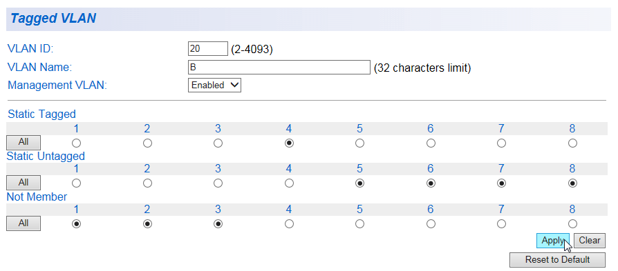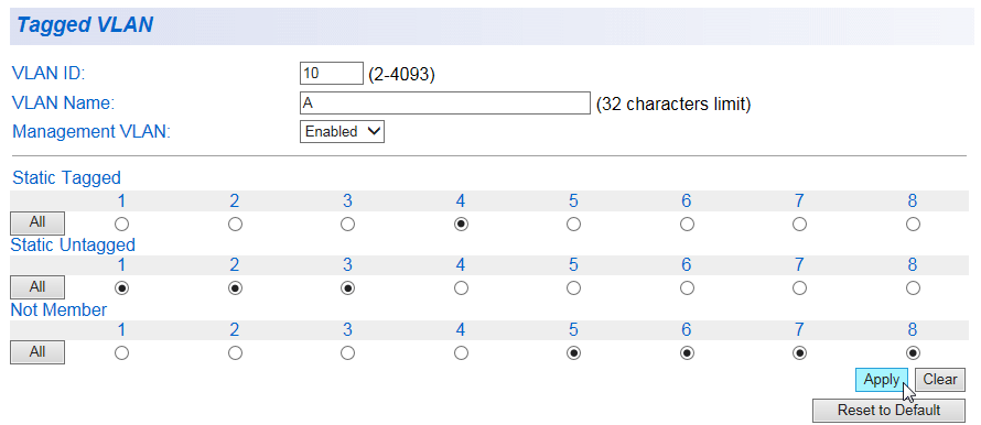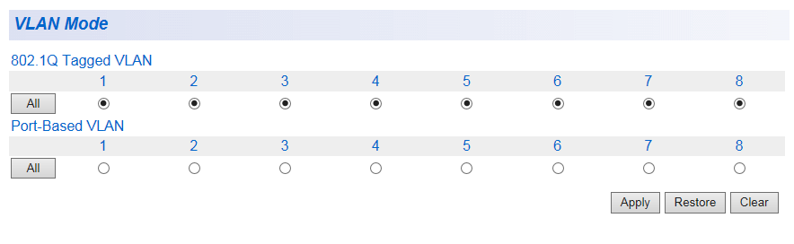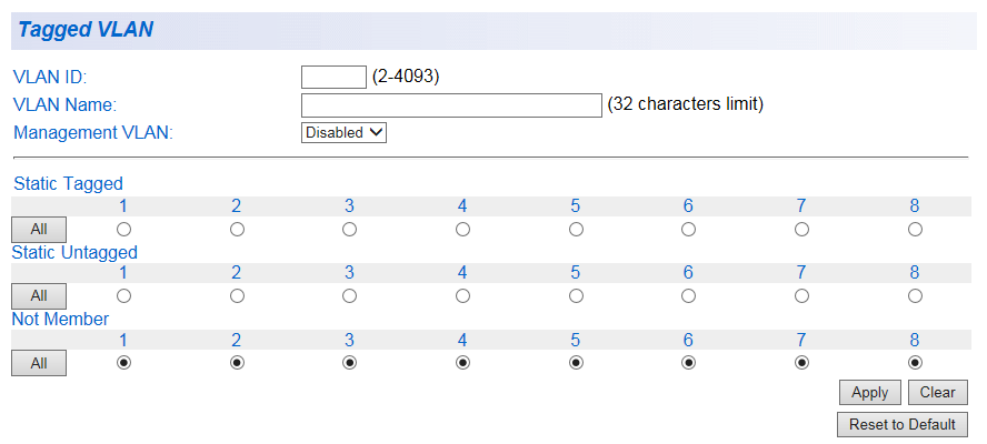 | Clear | すべてのポートをタグVLANとして選択します。 |