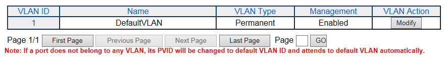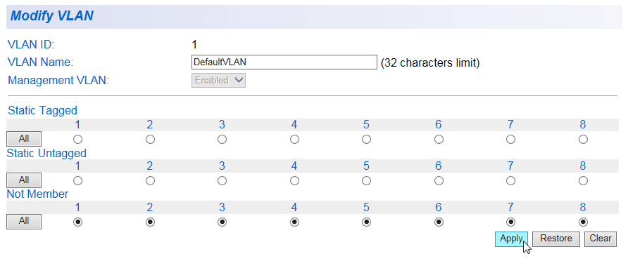 Note - VLANを何も設定していない状態ではデフォルトVLAN(PVID=1)としてTagged VLAN Tableに表示されます。