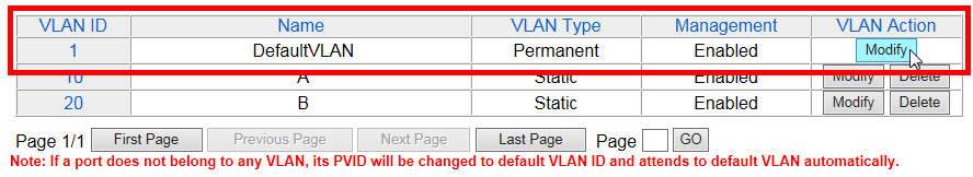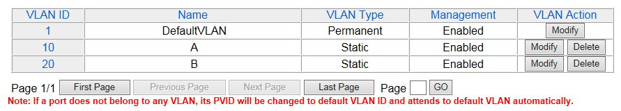 | VLAN Action | 対象VLANの操作を選択します。 「Modify」をクリックすると、クリックしたエントリーの内容を変更します。 「Delete」をクリックすると、クリックしたエントリーを削除します。 デフォルトVLAN(VLAN ID=1)は削除できません。 |