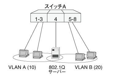 | ポート4 | 送信:ポート4から送信するフレームは、VLAN A宛てならVID=10のタグ付きで、VLAN B宛てならVID=20のタグ付きで送信される 受信:ポート4ではVLAN A、B両方のトラフィックを受信する。受信するフレームはタグ付き。タグのVIDにより、所属VLANを判断する |