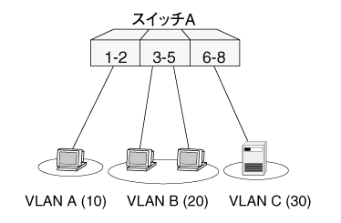| ポート1〜3 | 送信:ポート1〜3から送信するフレームはVLAN A宛てのタグなしフレーム 受信:ポート1〜3で受信したタグなしフレームはVLAN A(VID=10)所属とみなされる |
