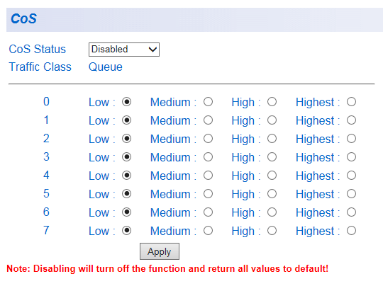 | CoS Status | CoS(Class of Service)のEnabled/Disabled(有効/無効)を設定します。デフォルトは「Disabled」です。 |