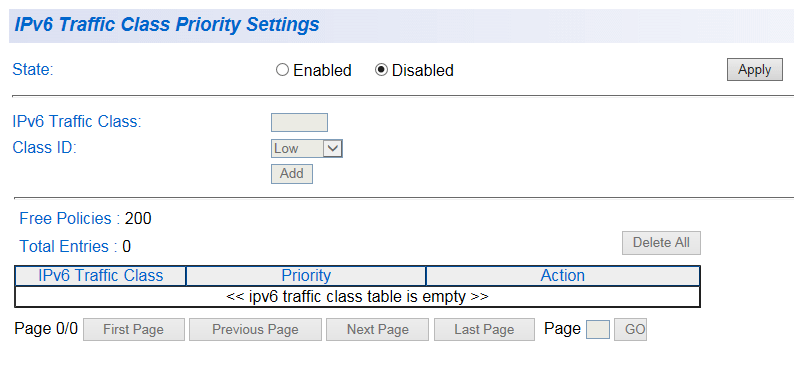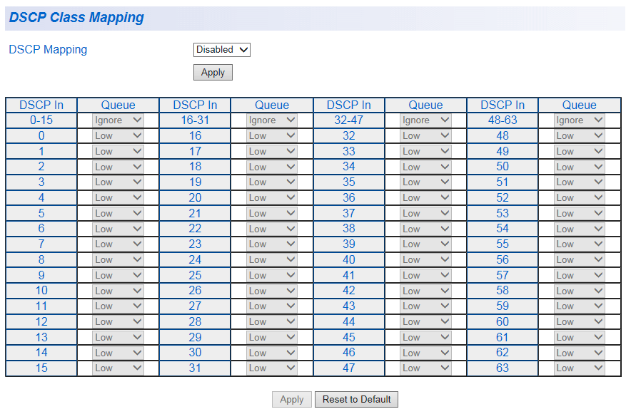 | DSCP Mapping | DSCPマッピング機能のEnabled/Disabled(有効/無効)を設定します。デフォルトは「Disabled」です。 |